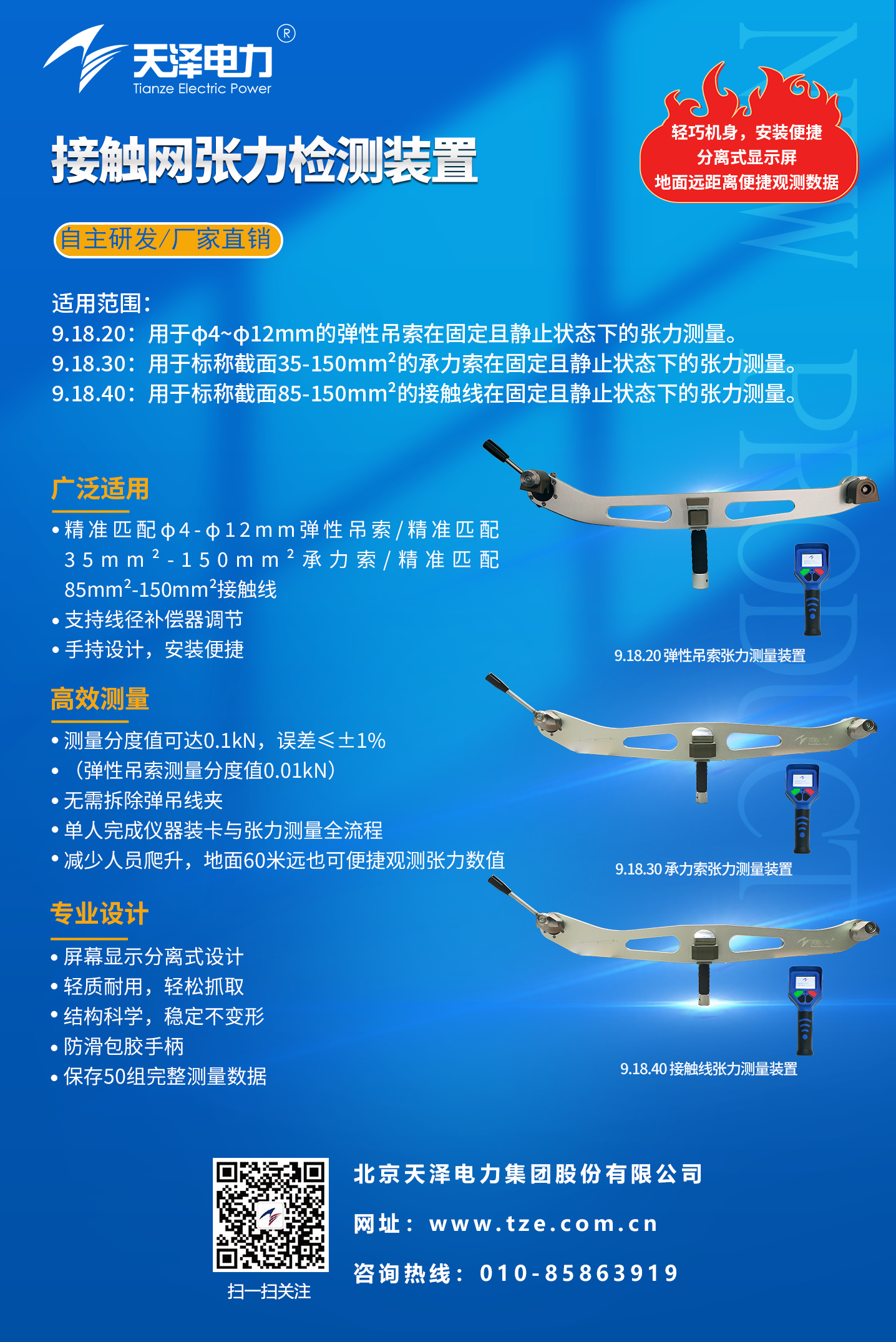 解决方案:应运而生的接触网张力检测装置9.18.20 / 9.18.30 / 9.18.40,三款产品分别对应铁路接触网三种核心线索(弹性吊索、承力索、接触线)进行张力检测,0.1kN/0.01kN高精度的测量分度值,支持单人快速完成全流程操作,是现场检测的高效之选!