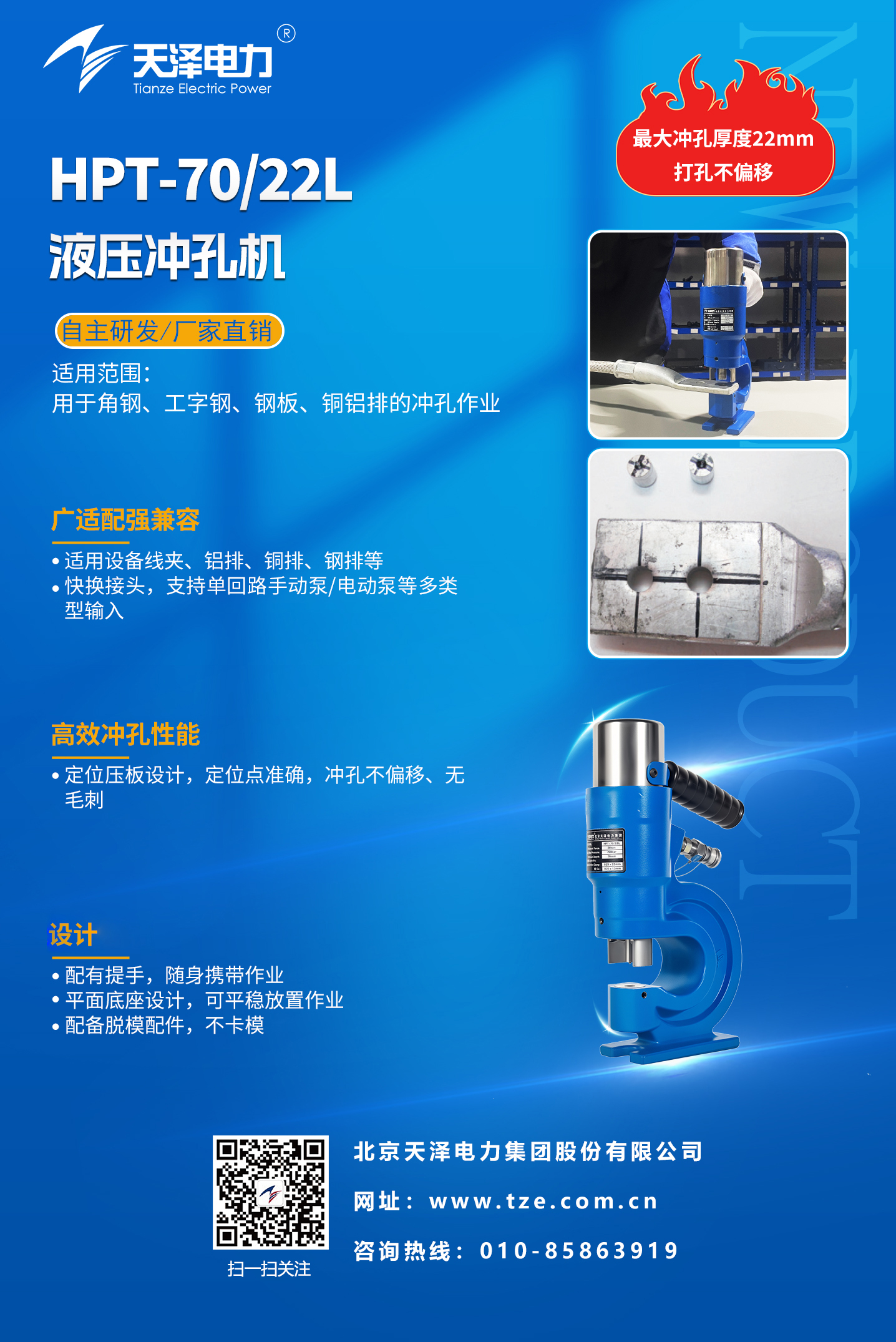 解决方案:针对上述痛点,天泽电力自主研发液压冲孔机HPT-70/22L通过轻量化设计、定位系统、无毛刺冲孔技术三大核心创新,系统性提升设备性能,实现了精度、安全性与操作效率的质变。