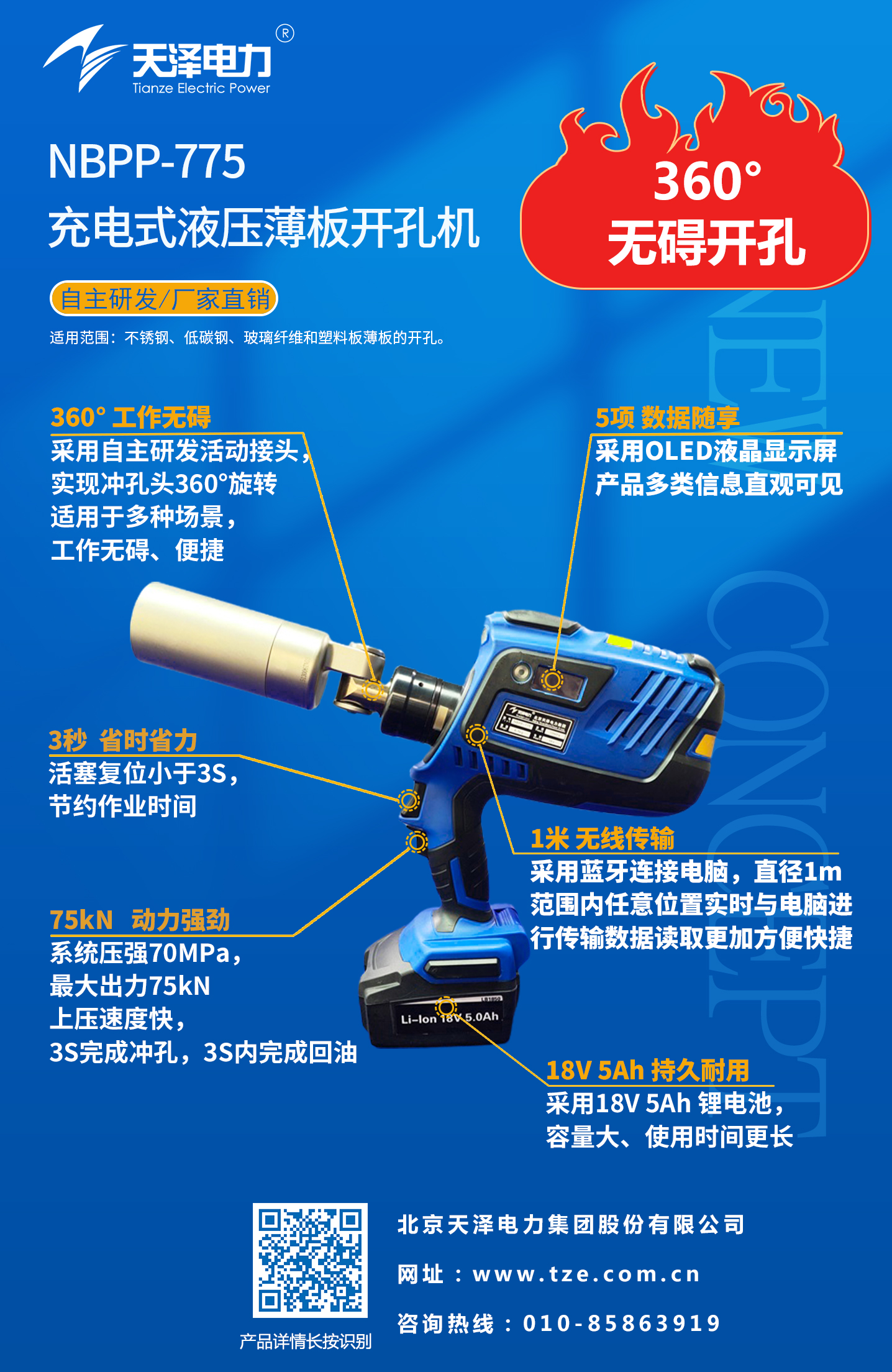 解决方案:针对上述痛点,天泽电力为您推荐一台自主研发的充电式液压薄板开孔机--NBPP-775,独特的功能设计,一机解决你所有问题。它适用于不锈钢、低碳钢、玻璃纤维和塑料板薄板的开孔!。