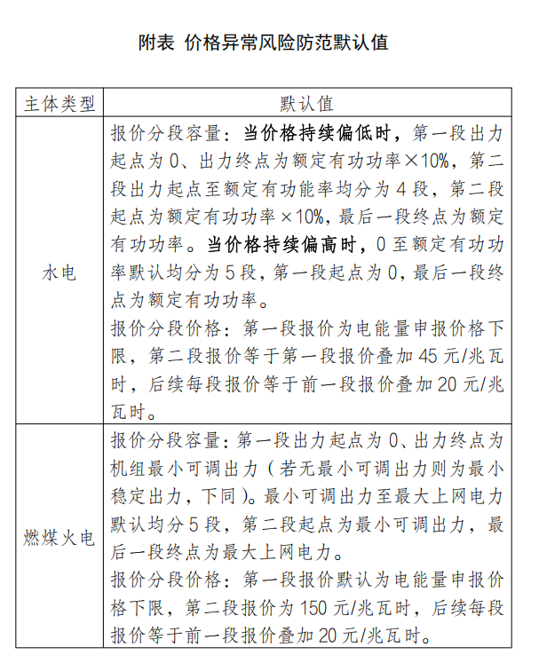 三是市场价格异常风险防范措施执行期间,水电、燃煤火电应按上述要求申报交易信息,若申报不符合要求或未及时申报的,则按价格异常风险防范默认值参与出清。价格异常风险防范默认值详见附表。
