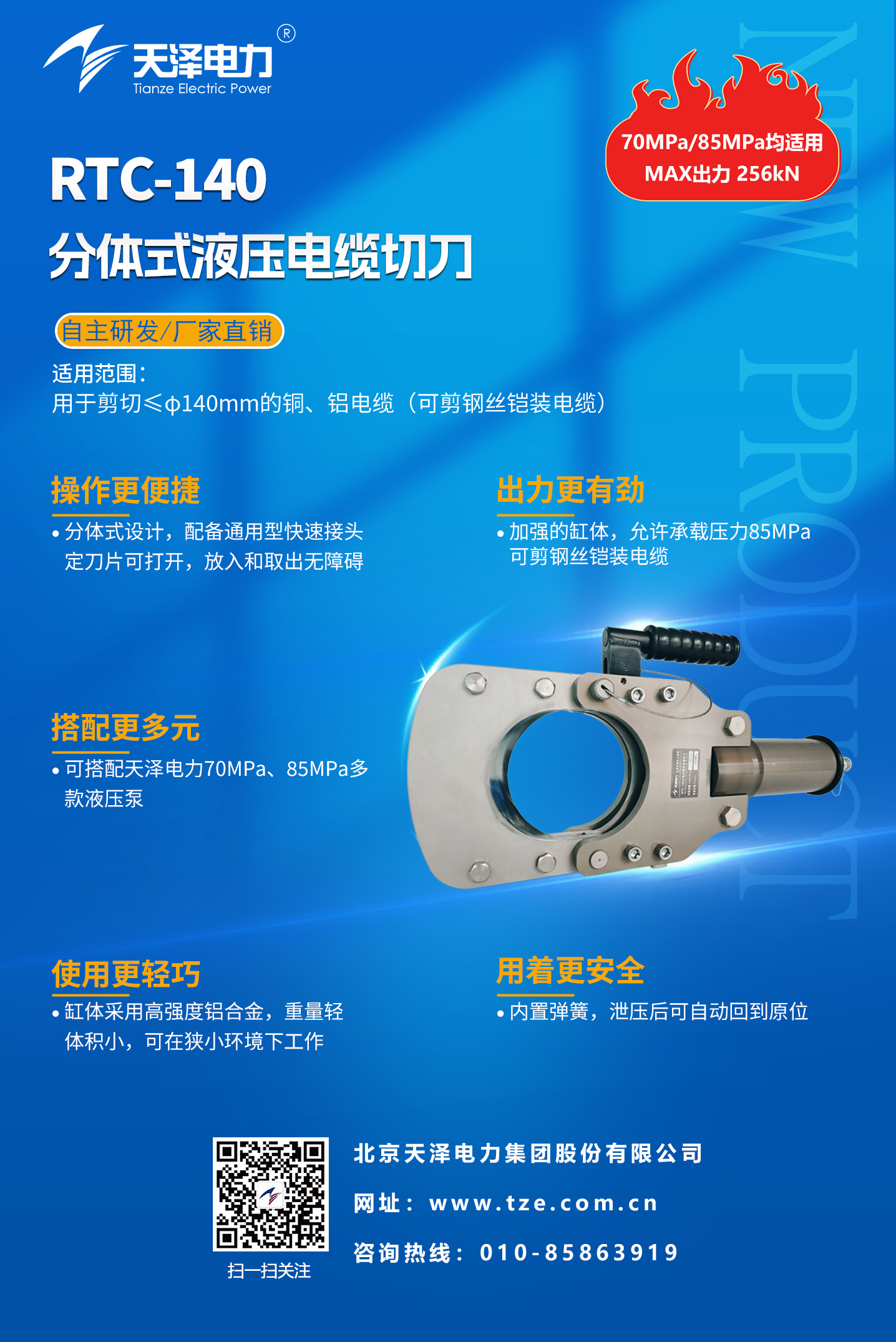 解决方案:针对以上行业顽疾,我们隆重推出专为重型电缆切割设计的 RTC-140分体式液压电缆切刀。它不仅仅是一个工具,更是一套高效、安全、省力的系统化解决方案。